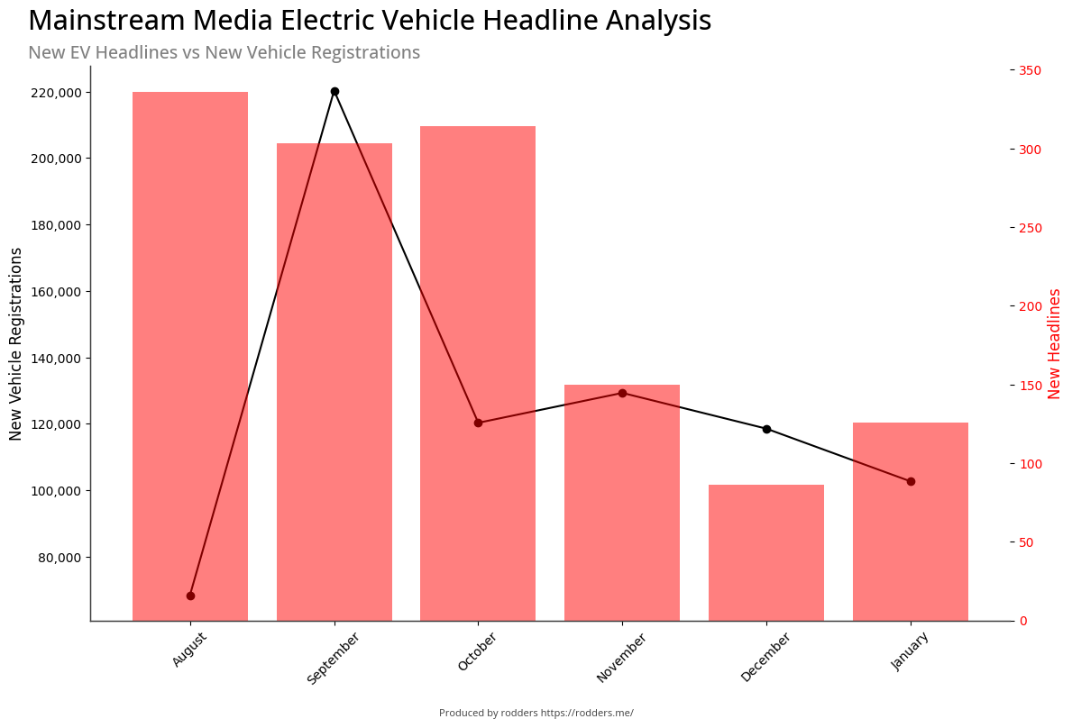 This type of headline follows the cyclical pattern of EV shipments, since nearly all EVs sold in the UK are imported, availability is limited to manufacturing and shipping lead times. Tesla tends to make up the bulk of EV Shipments and they have an end of quarter push where there is a measurably large increase in EV registrations in the last month of the quarter, with much lower registrations in the first and second month of the quarter. This data is published by the SMMT and used by publications as justification for this type of headline. So it should come as no surprise that this type of headline peaks in October, November, and August.