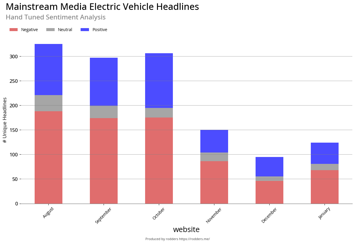 The analysis reveals a concerning trend: as the peak new registration period for electric vehicles approached in September, sentiment in certain publications headlines shifted dramatically, with an increase in both the negative language and the quantity of new headlines published. This study's findings suggest that mainstream media outlets may be playing a significant role in shaping public perception of EVs, and further research is needed to understand the implications of this phenomenon on the adoption and development of sustainable transportation solutions.