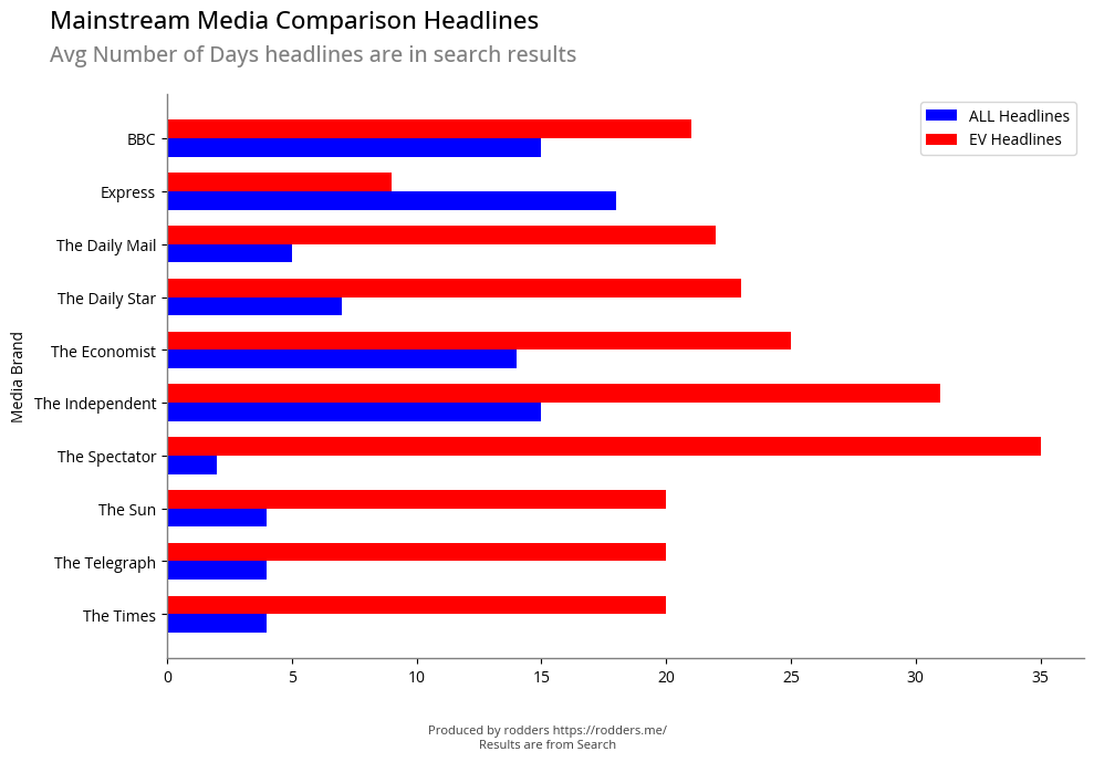 It must be recognised that EV headlines (which are lesser in volume) would be visible for longer than general news headlines. General news headlines are produced at a higher volume and therefore churn off the search results faster than EV headlines. Therefore no reasonable conclusion that can be draw from this data.