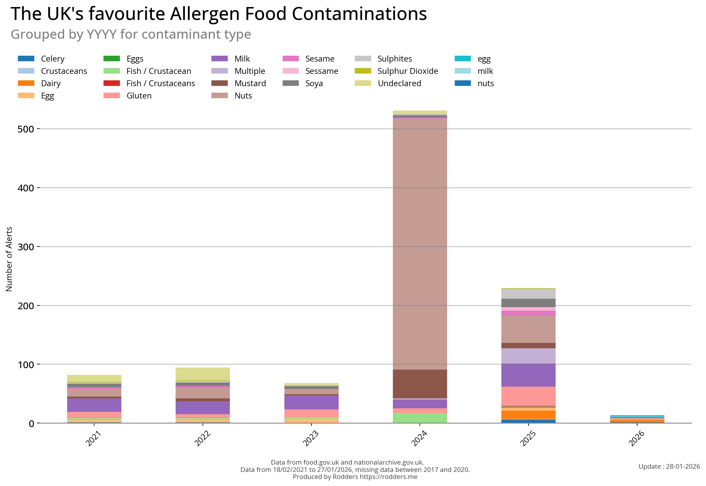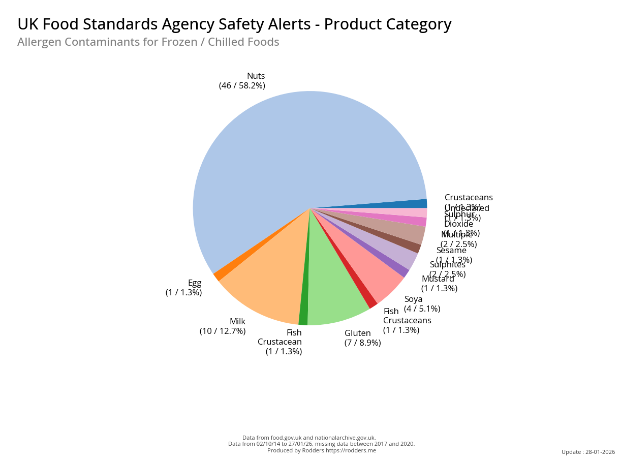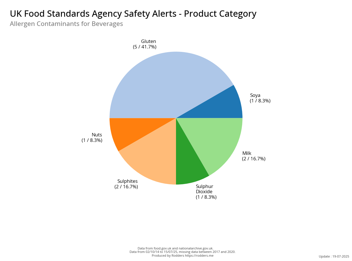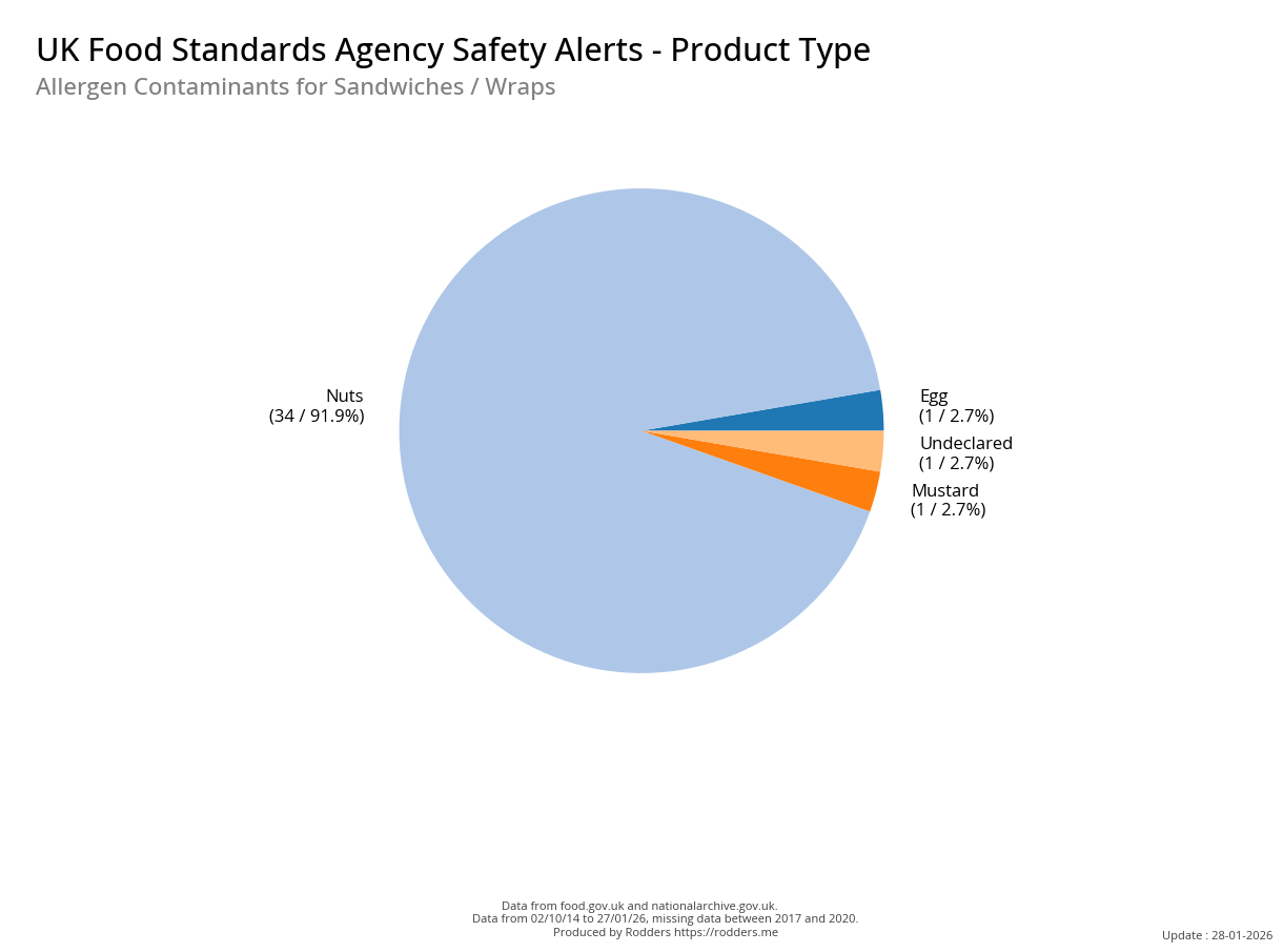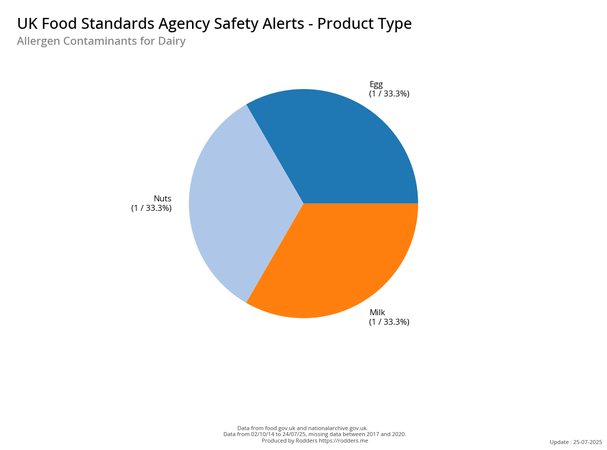 This section of the analysis focuses on a comprehensive review of food safety alerts issued by the FSA with a specific emphasis on allergenic substances such as peanuts, tree nuts, milk, eggs, fish, shellfish, soy, and wheat. By examining these data, this study aims to assess the effectiveness of the current alert system in detecting and responding to outbreaks, identify trends and patterns in the types of allergens involved, and provide insights that can inform strategies for improving food safety and reducing public health risks.