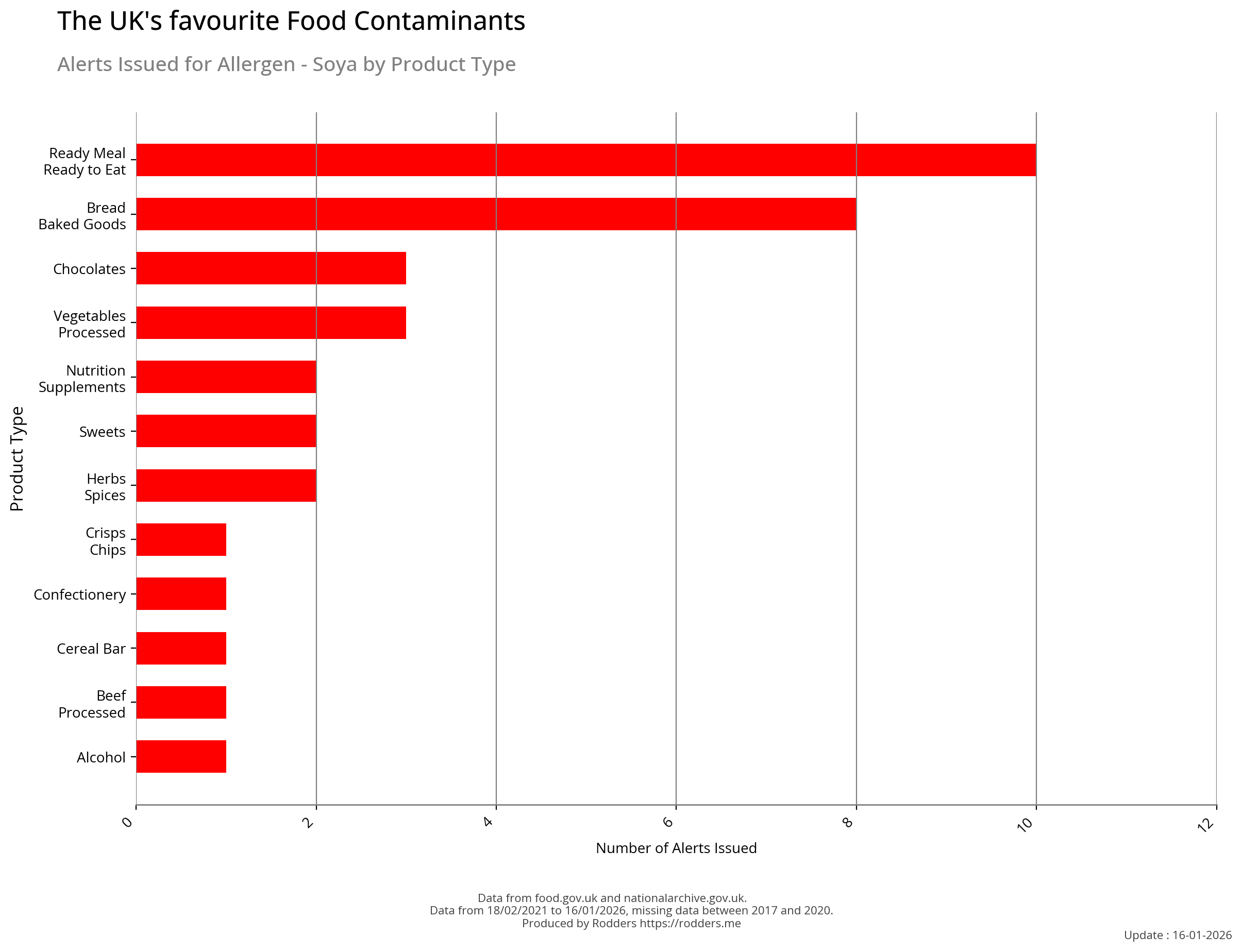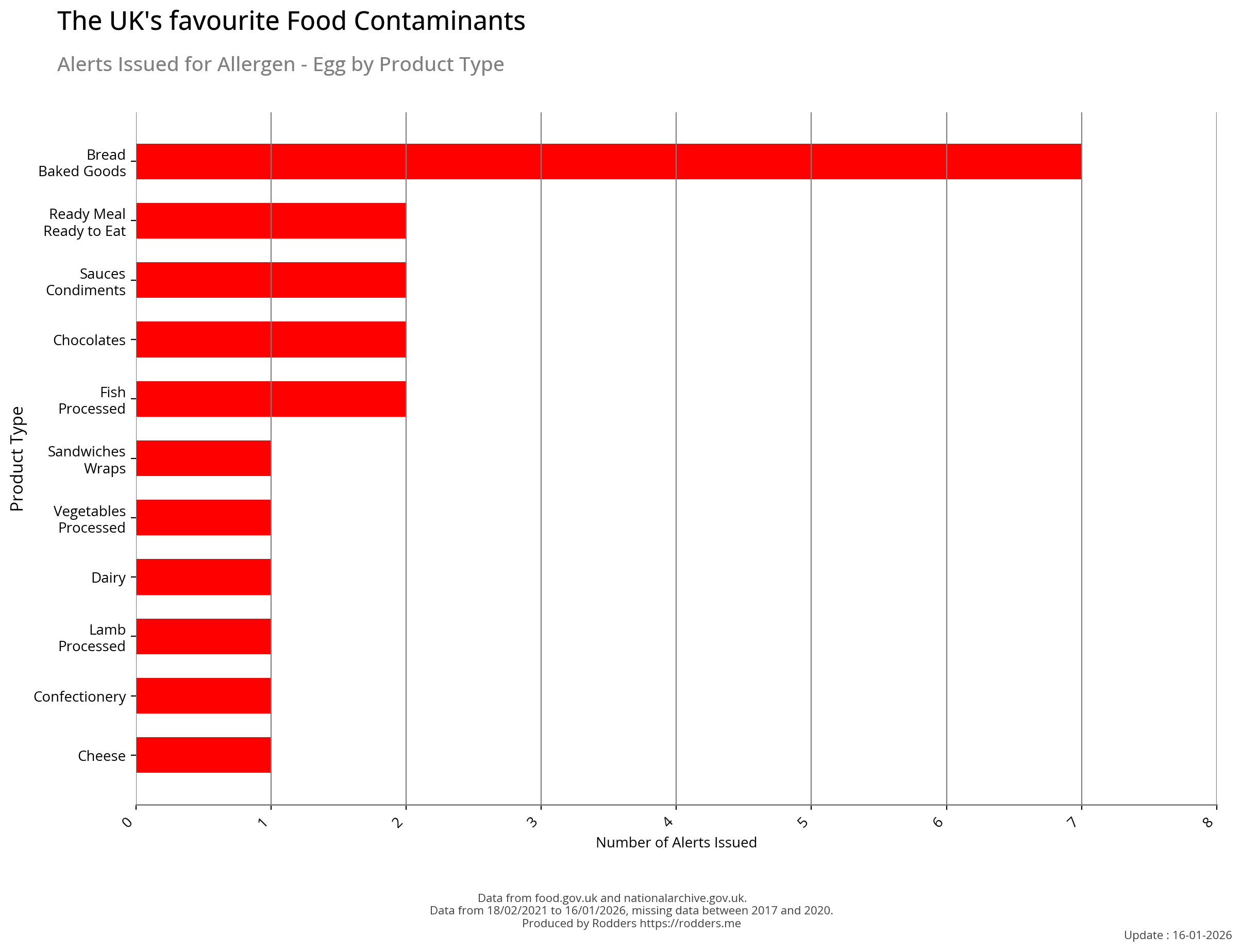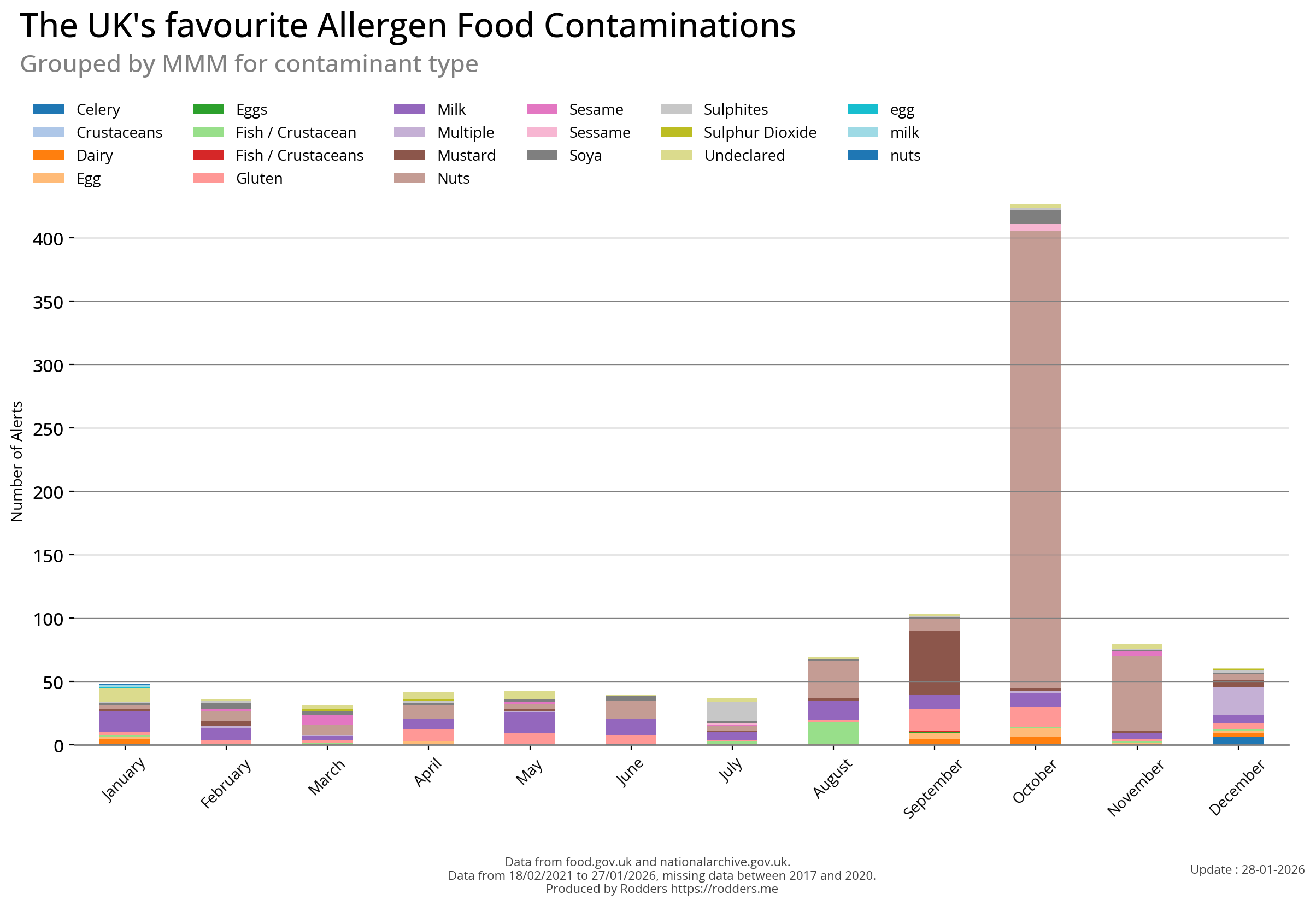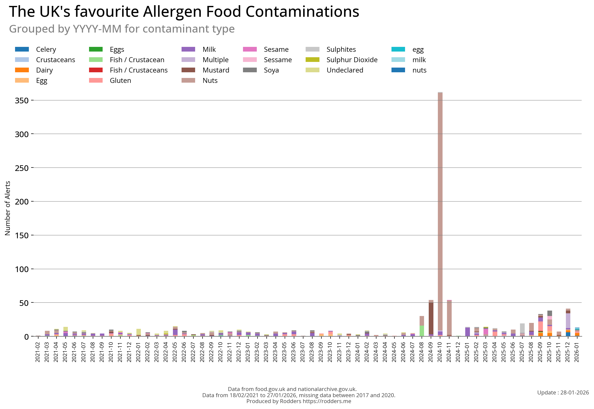 This section of the analysis focuses on a comprehensive review of food safety alerts issued by the FSA with a specific emphasis on allergenic substances such as peanuts, tree nuts, milk, eggs, fish, shellfish, soy, and wheat. By examining these data, this study aims to assess the effectiveness of the current alert system in detecting and responding to outbreaks, identify trends and patterns in the types of allergens involved, and provide insights that can inform strategies for improving food safety and reducing public health risks.