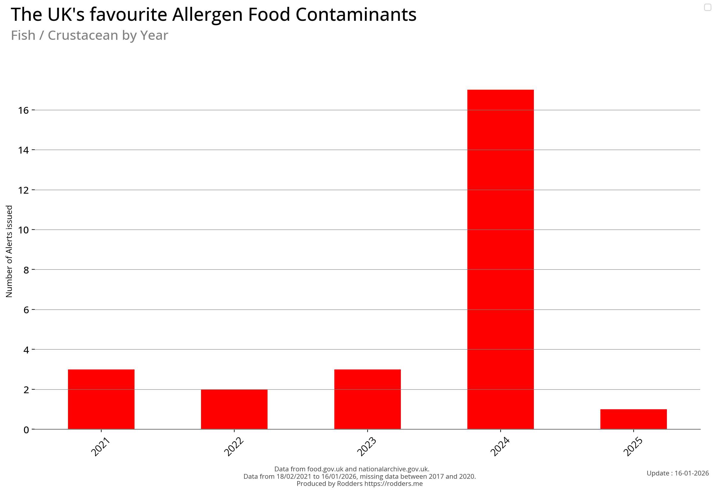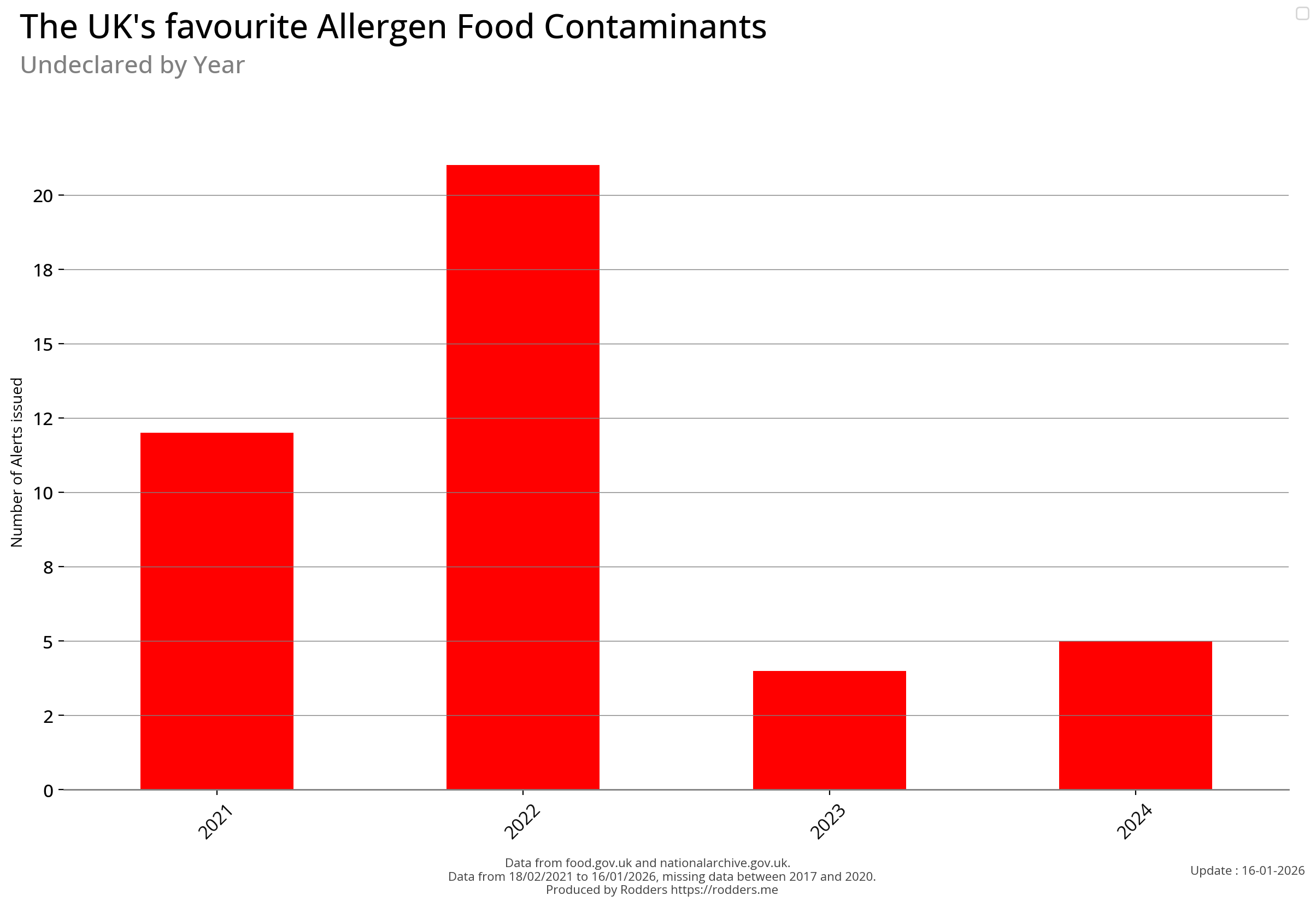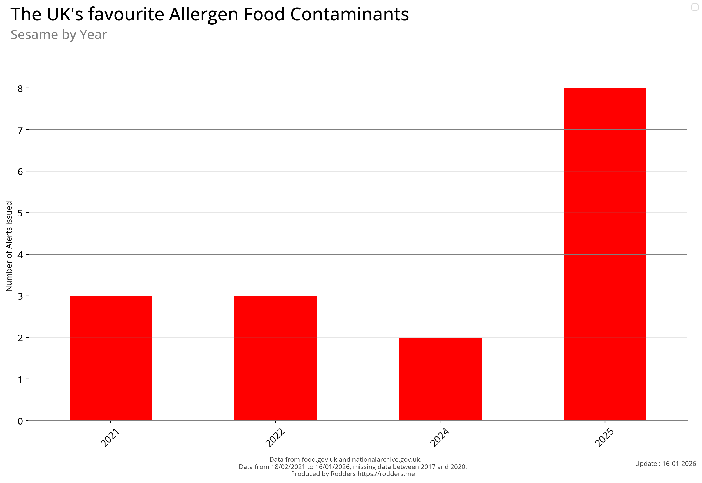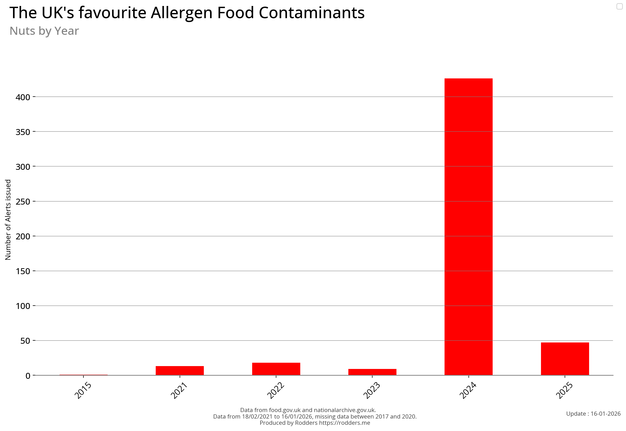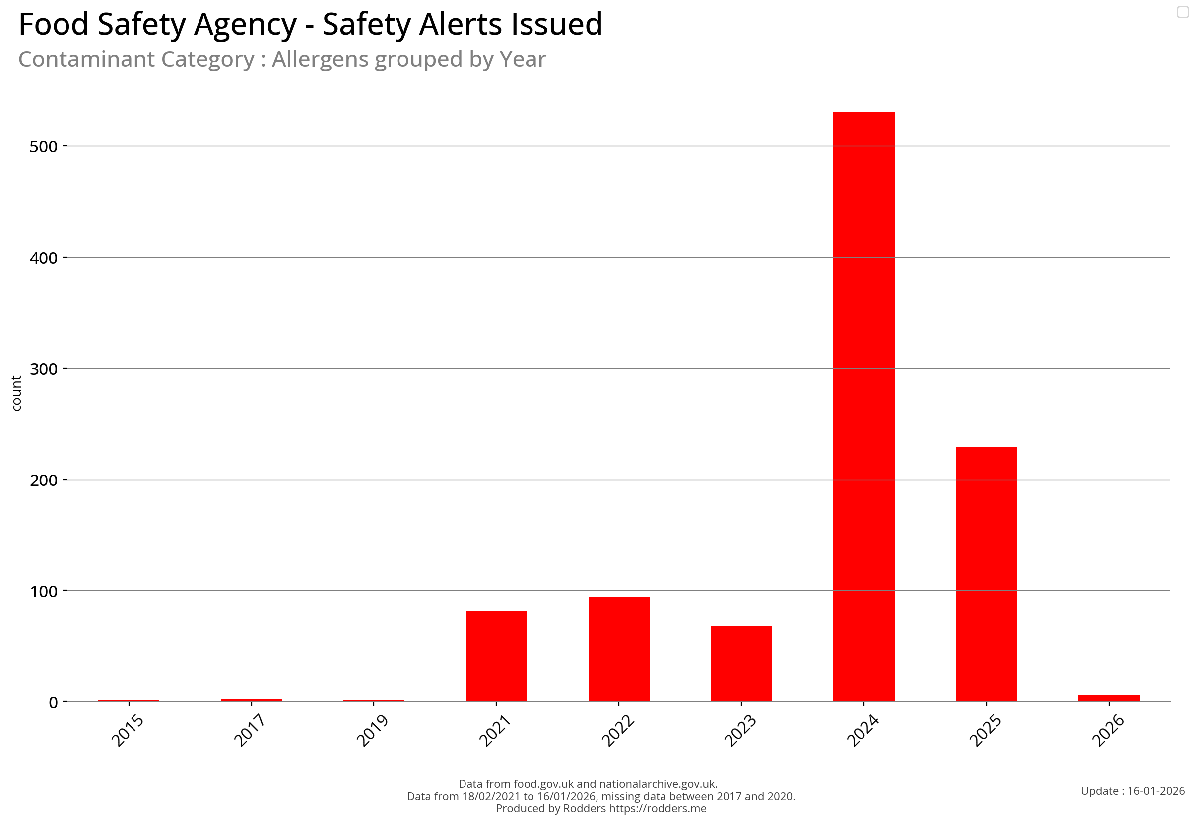 Note, data missing from 2017 to 2002. It appears that prior to 2017 Allergen Alerts were not being issued and with the missing data from 2017 to 2020, there are a lot less data points to visualise for Allergens compared to other Food Safety Alerts.