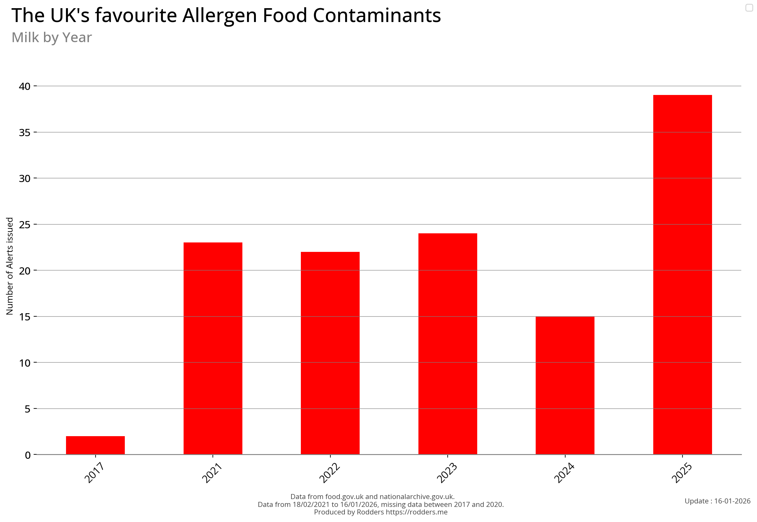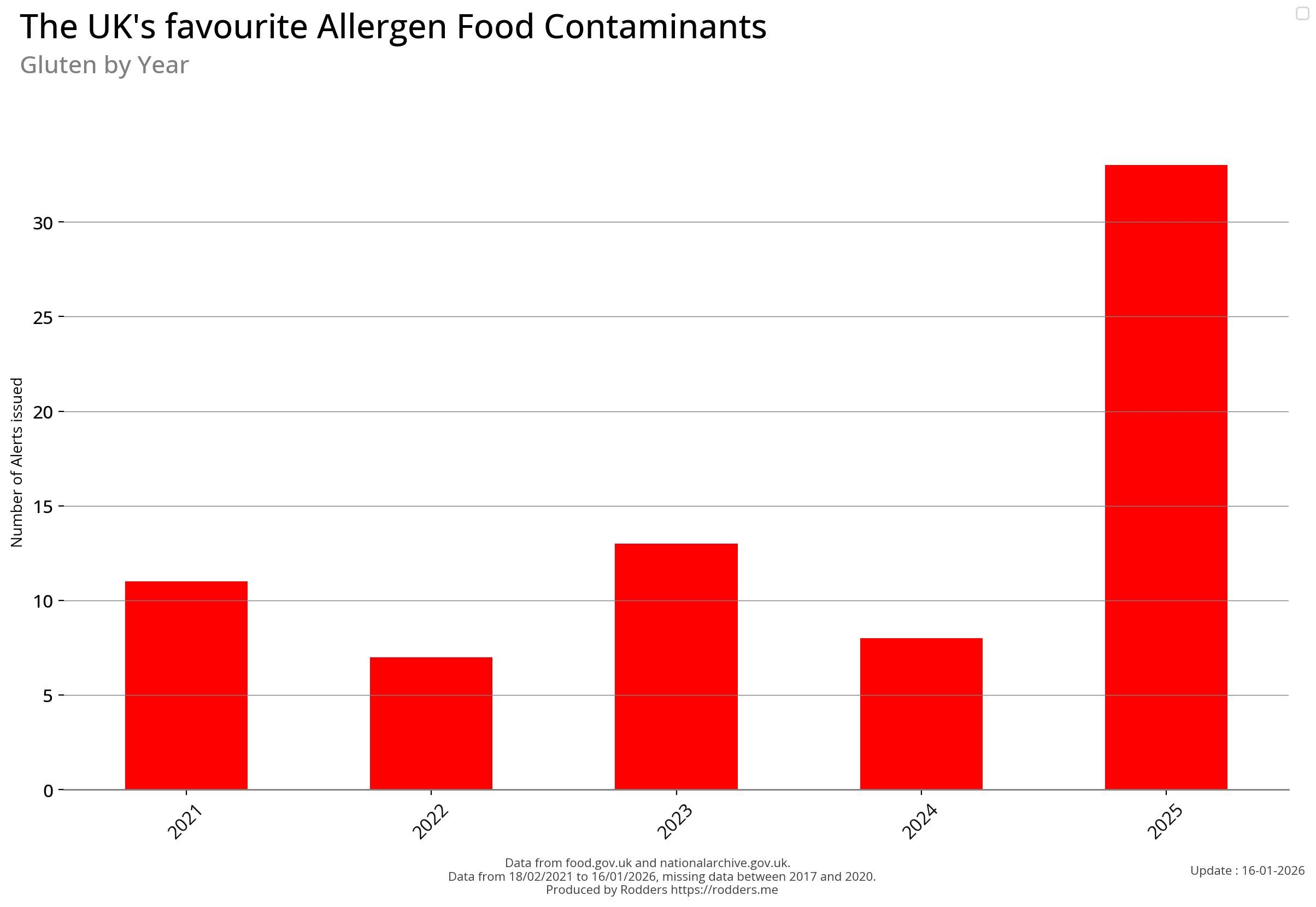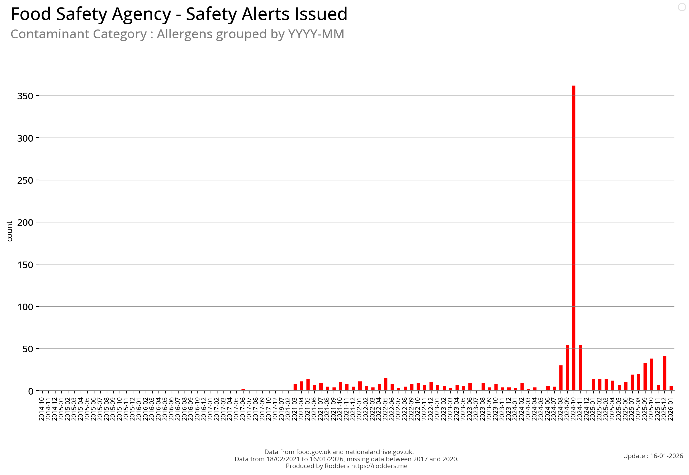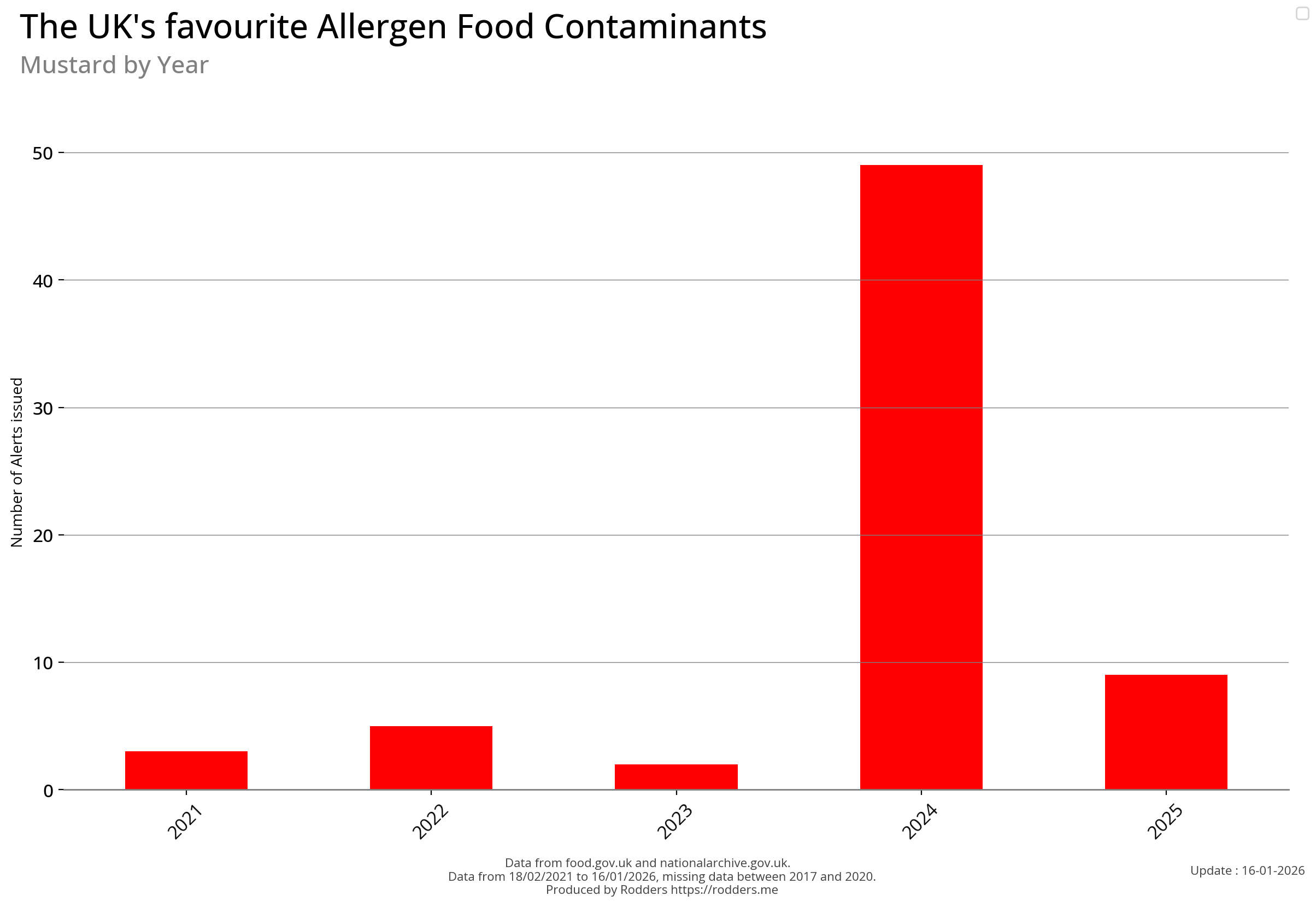Note, data missing from 2017 to 2002. It appears that prior to 2017 Allergen Alerts were not being issued and with the missing data from 2017 to 2020, there are a lot less data points to visualise for Allergens compared to other Food Safety Alerts.