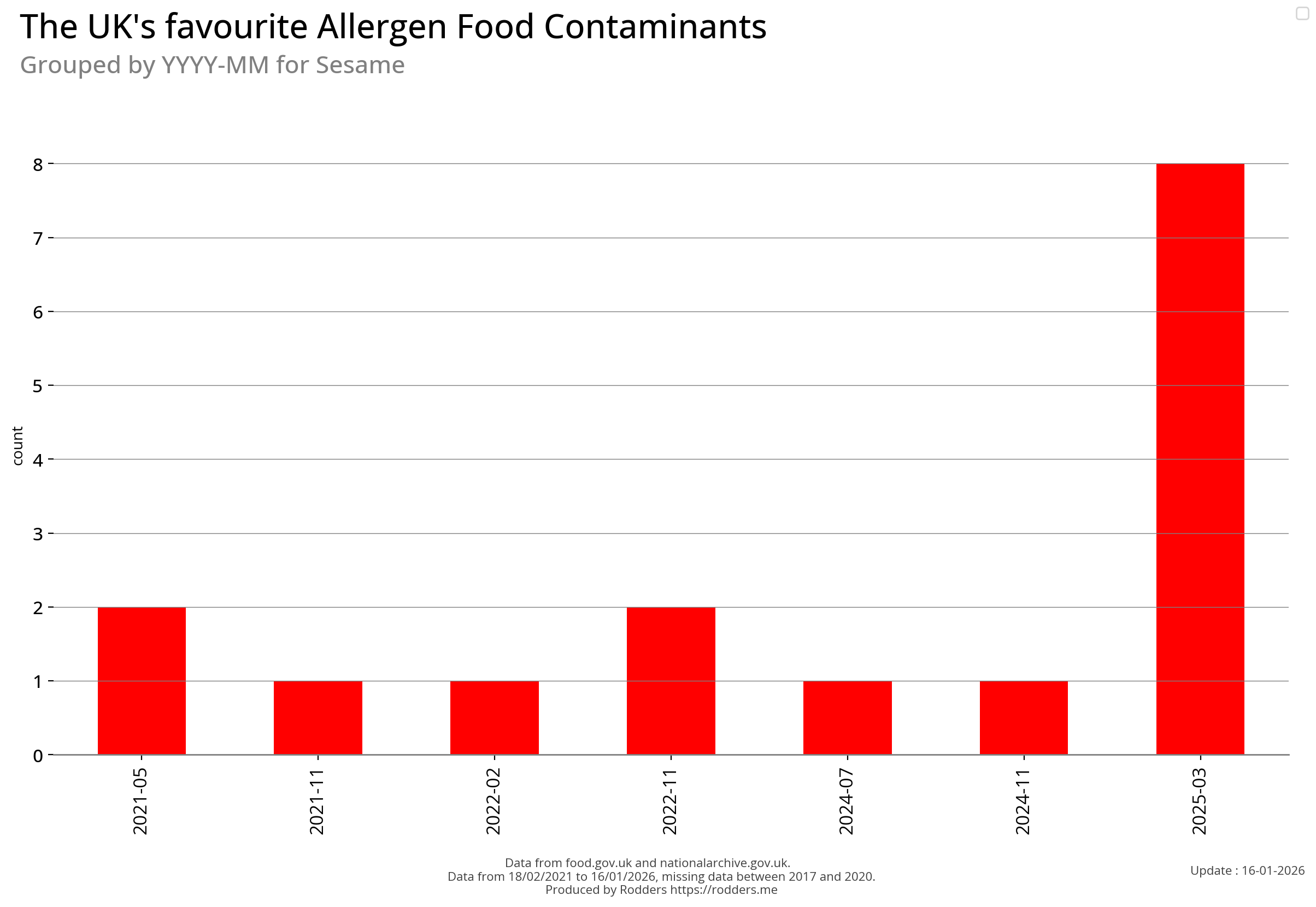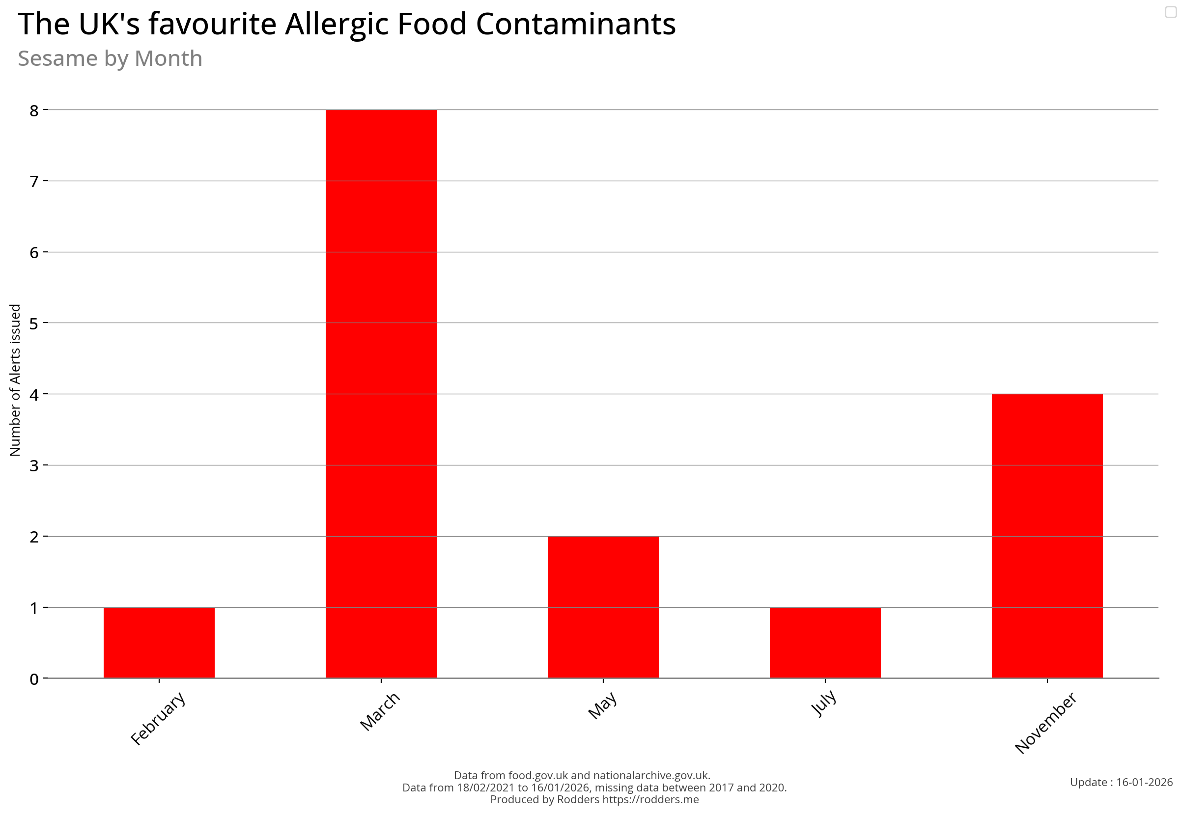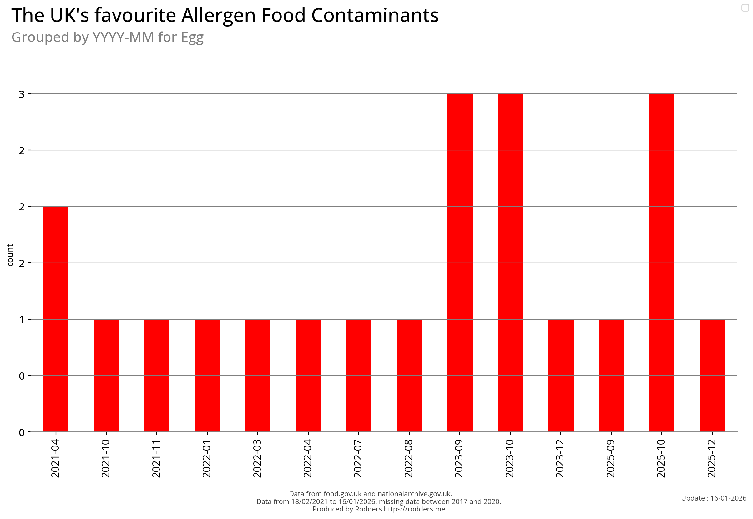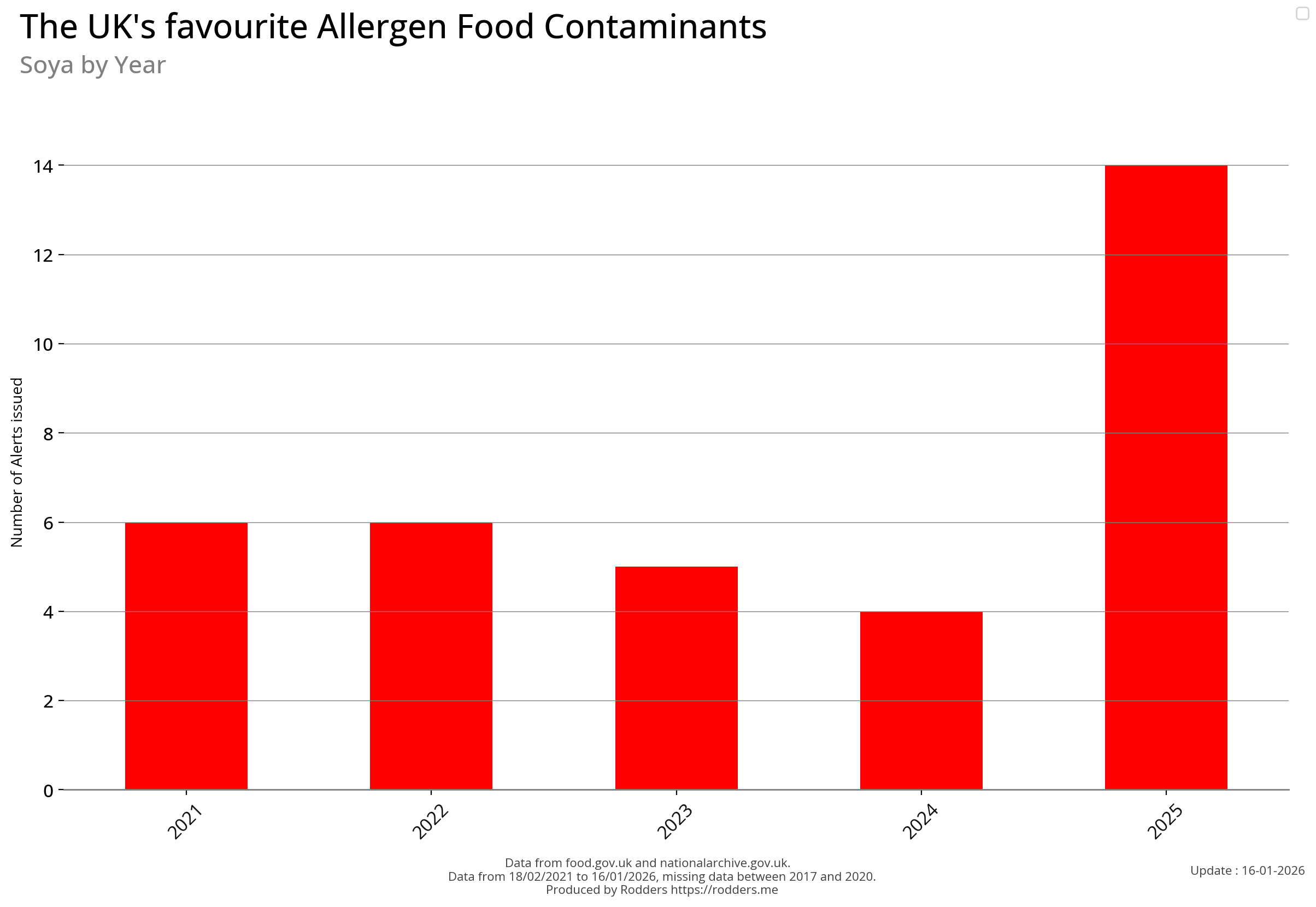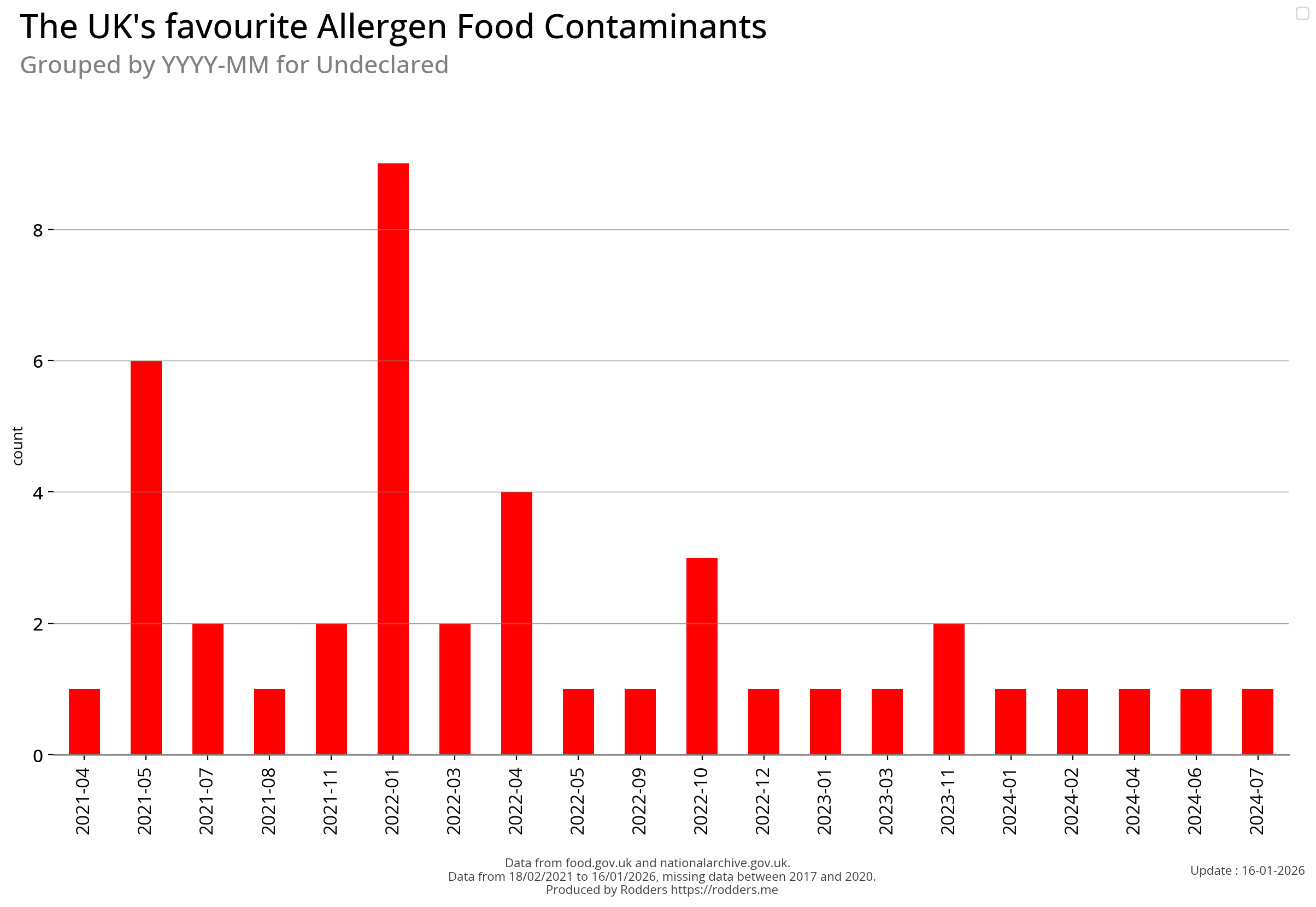 Note, data missing from 2017 to 2002. It appears that prior to 2017 Allergen Alerts were not being issued and with the missing data from 2017 to 2020, there are a lot less data points to visualise for Allergens compared to other Food Safety Alerts.