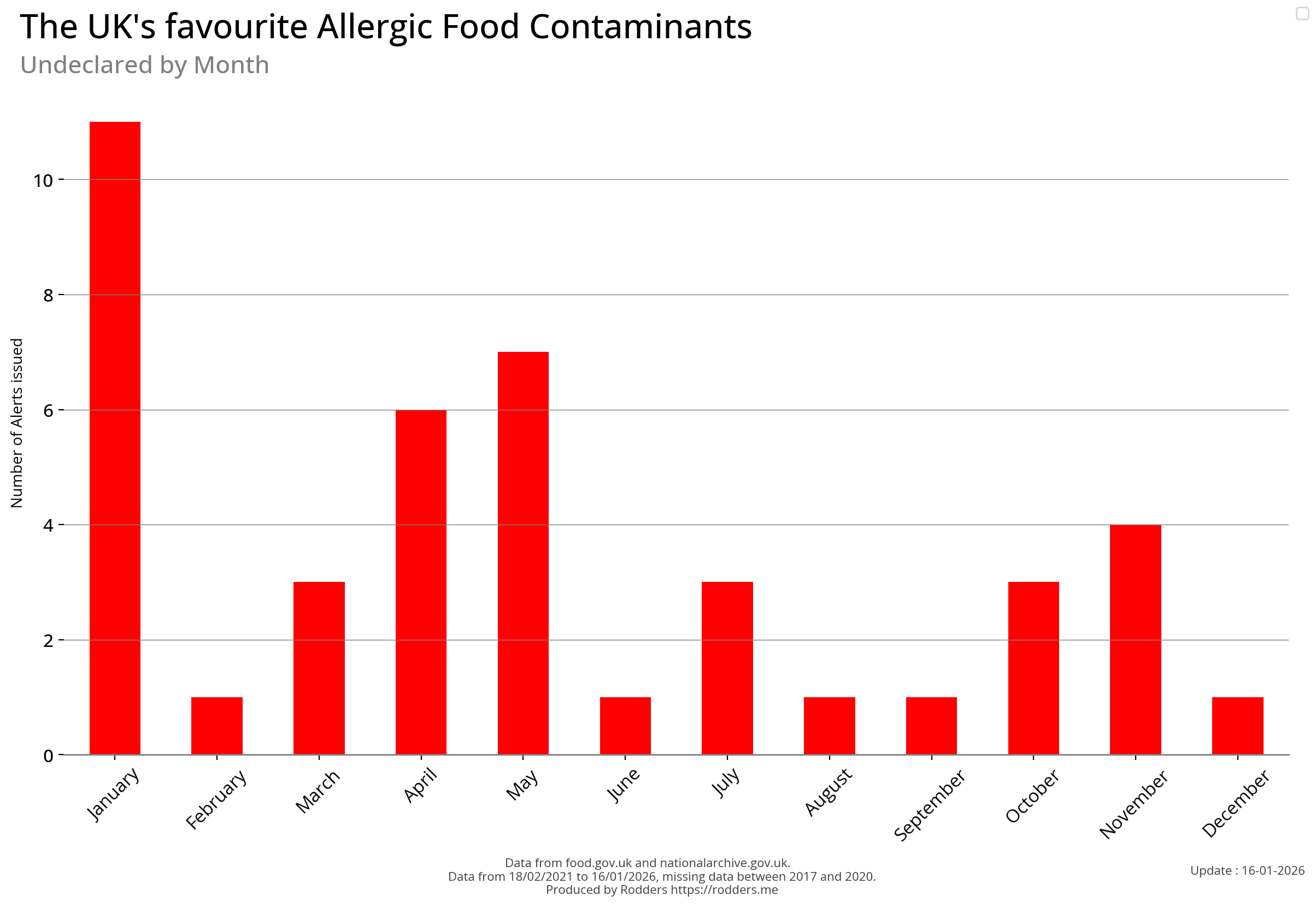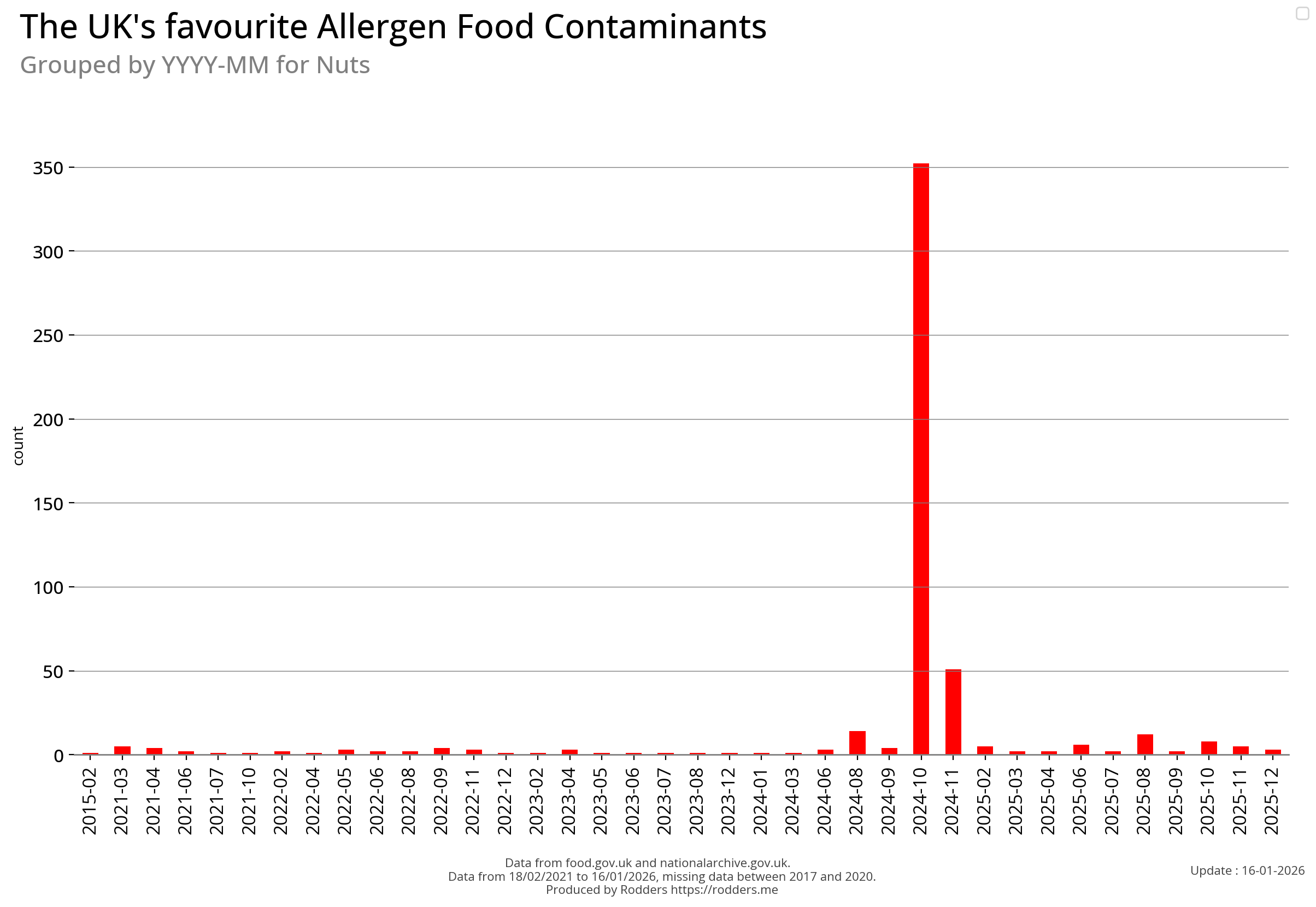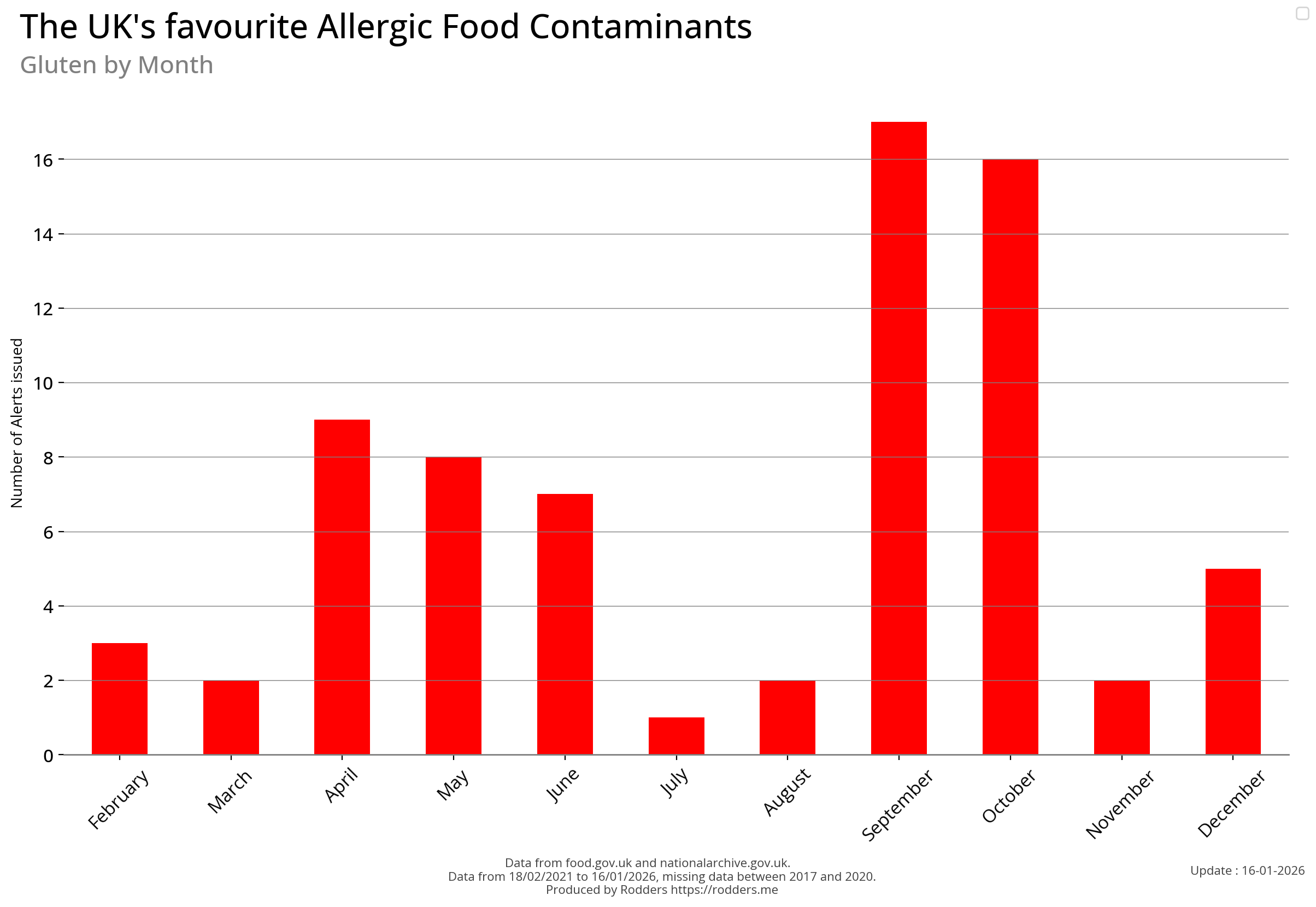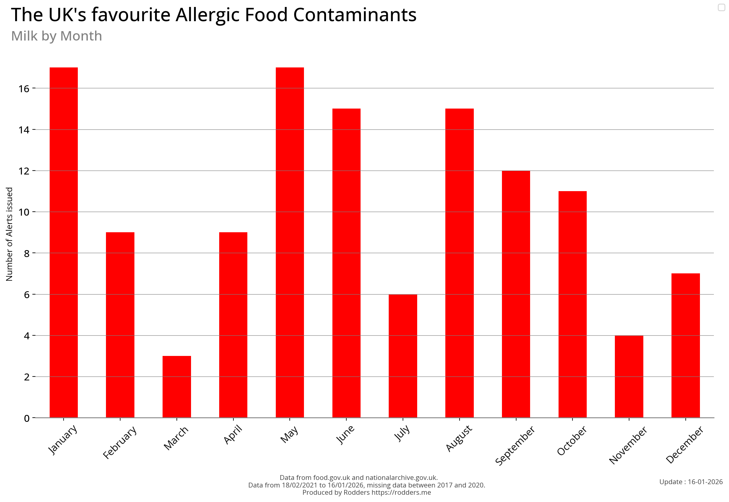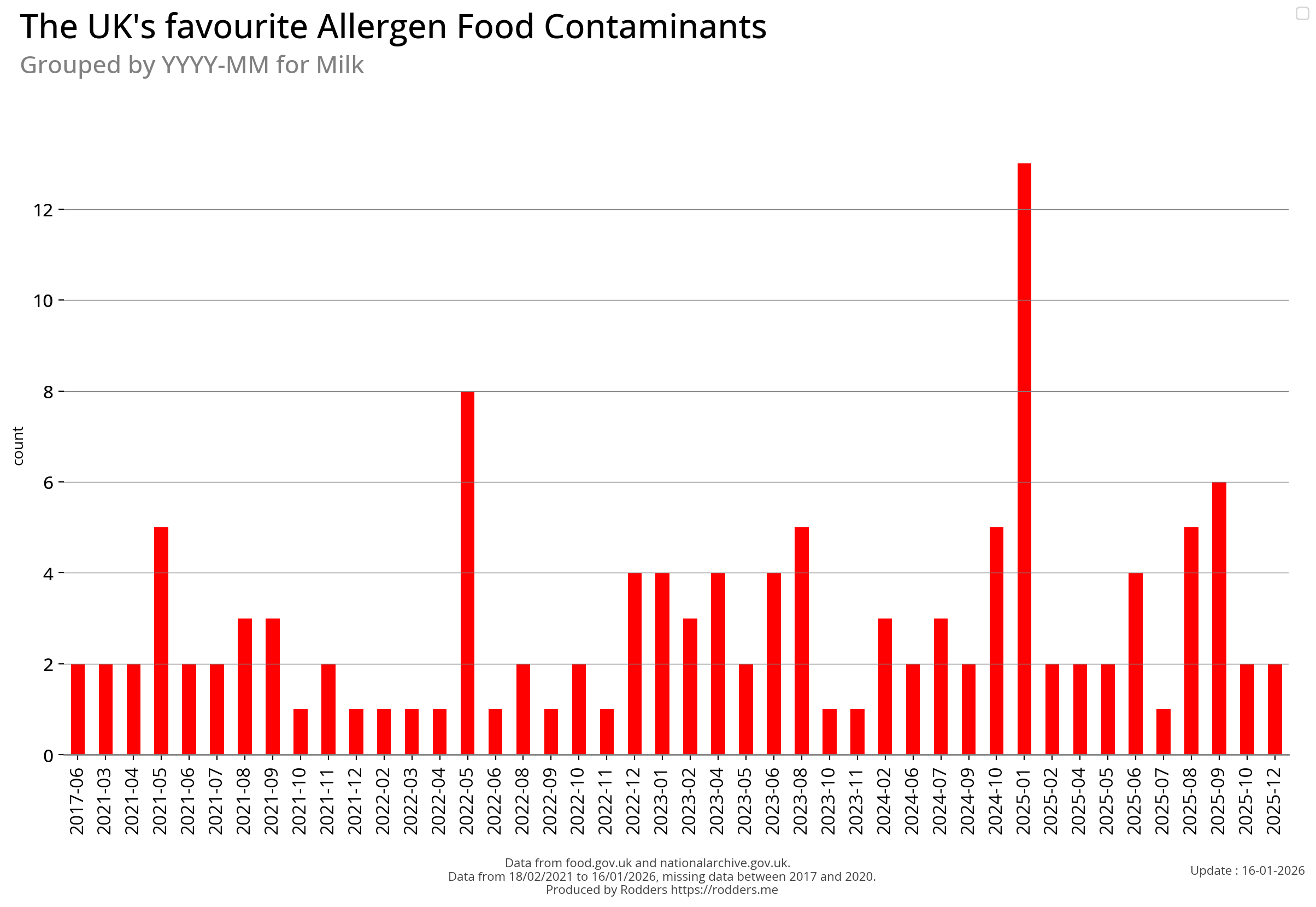Note, data missing from 2017 to 2002. It appears that prior to 2017 Allergen Alerts were not being issued and with the missing data from 2017 to 2020, there are a lot less data points to visualise for Allergens compared to other Food Safety Alerts.