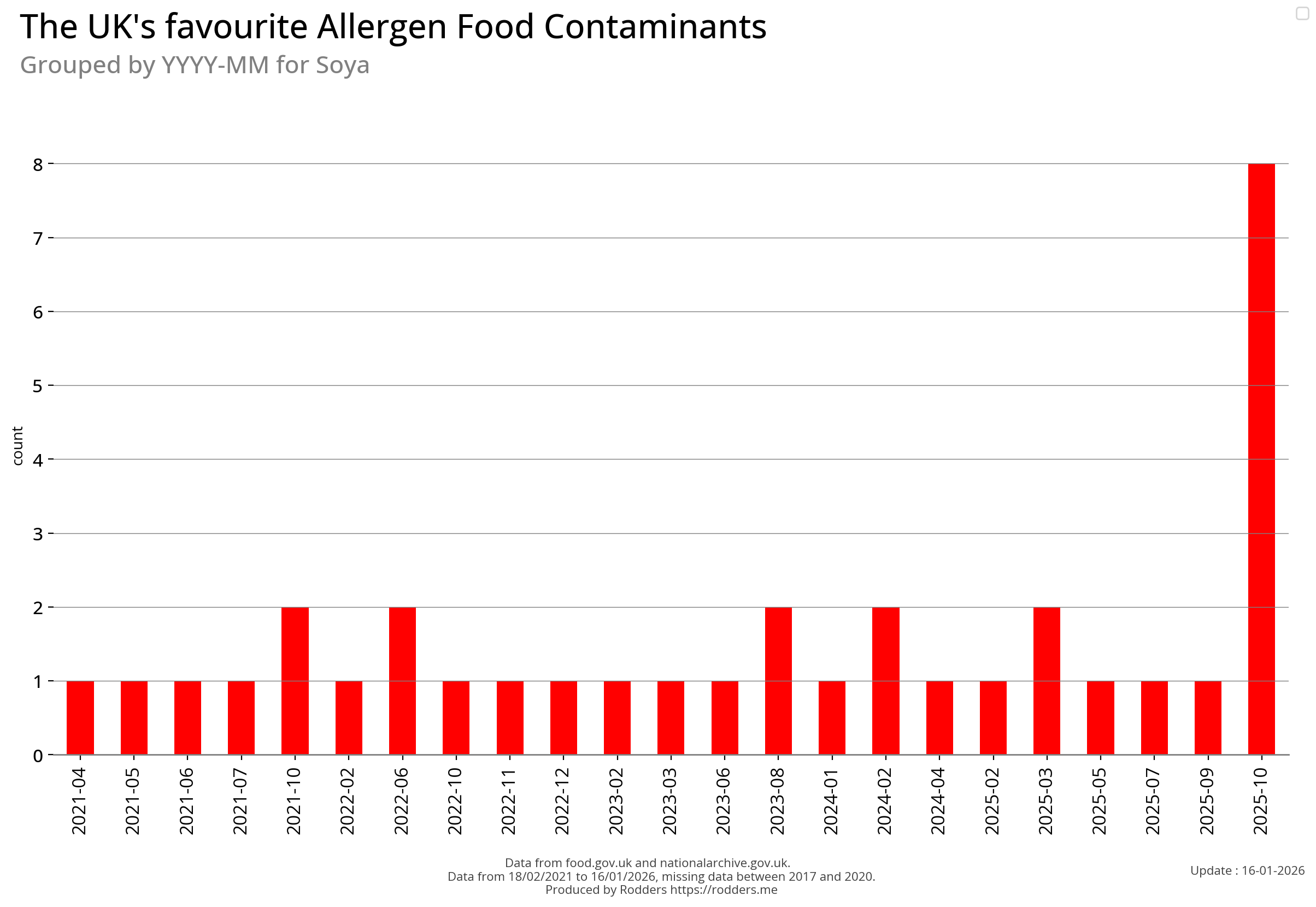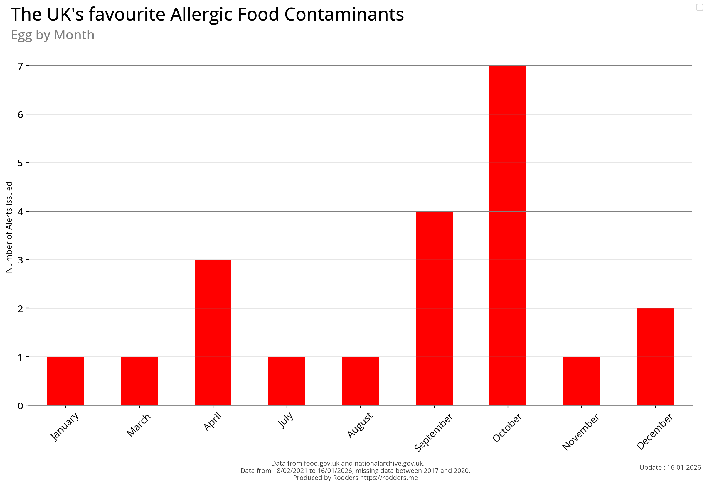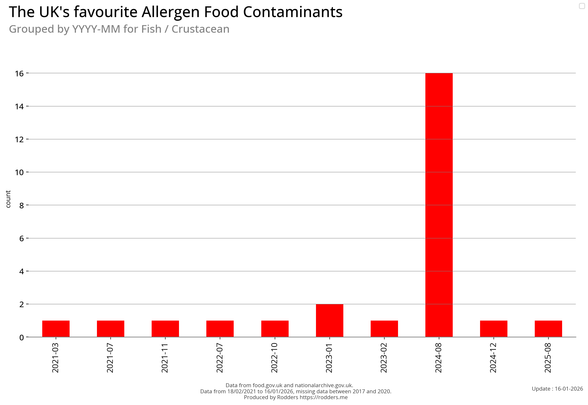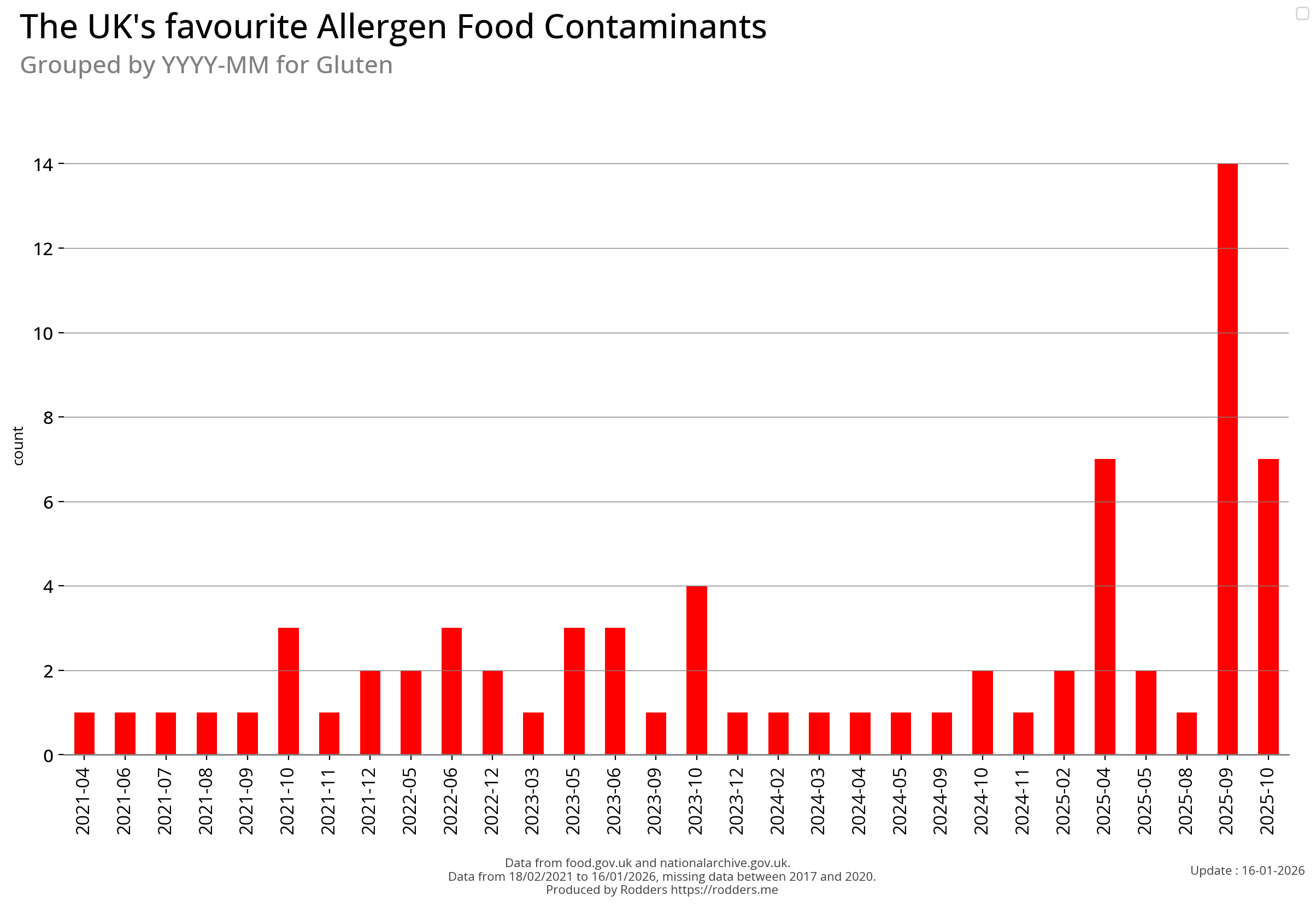 Note, data missing from 2017 to 2002. It appears that prior to 2017 Allergen Alerts were not being issued and with the missing data from 2017 to 2020, there are a lot less data points to visualise for Allergens compared to other Food Safety Alerts.