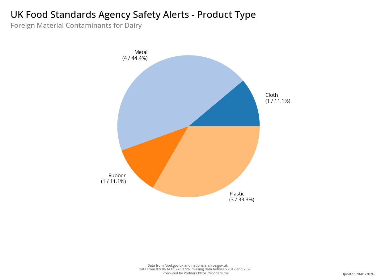 The predominant cause of Foreign Material Contamination food safety alerts are for pieces of metal, plastic,