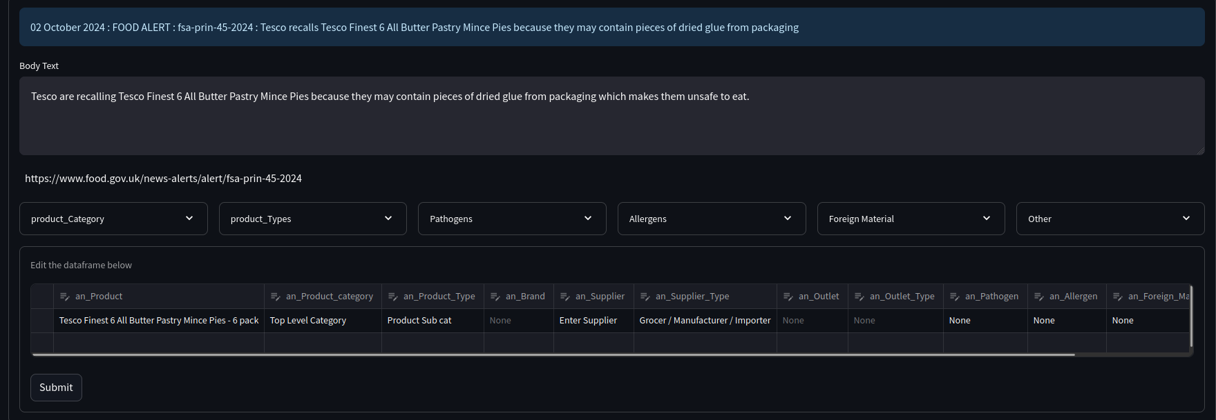 The user initiates a web scrape of the alert notice which populates as much of the data set as possible, leaving the remaining fields to be hand edited.